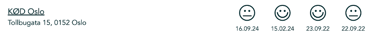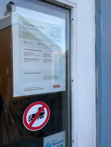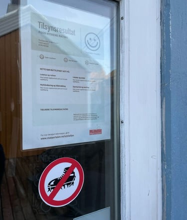 Imaginem que tenim interès a dinar al restaurant KØD Oslo del carrer Tollbugata 15 a Oslo i veiem la informació del rètol de l’entrada del restaurant (imatge següent) amb una cara seriosa, potser ens interessa llegir l’informe d’inspecció: